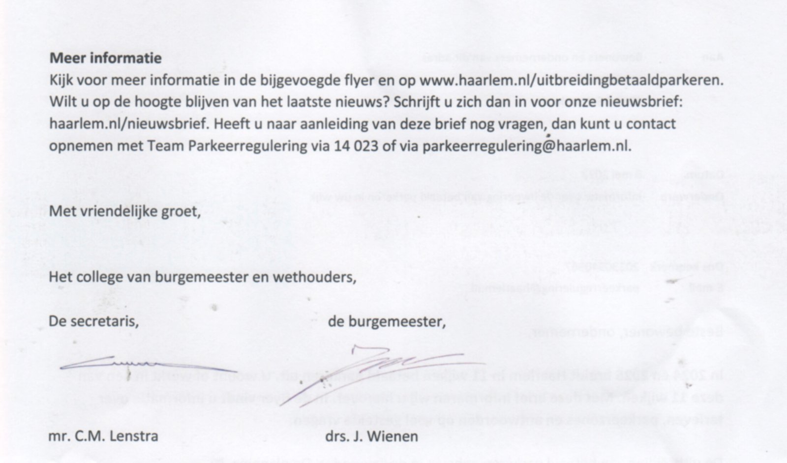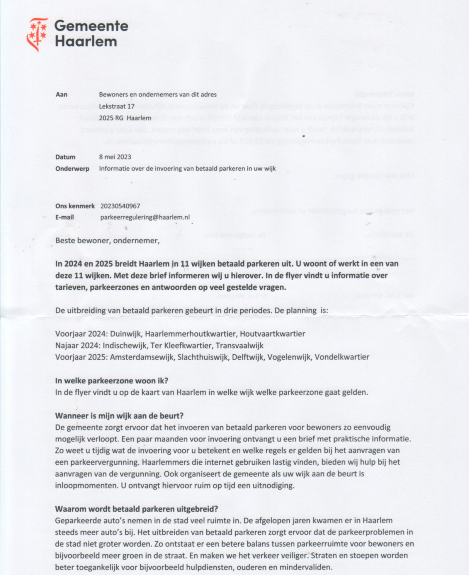 Brief van gemeente Haarlem aan bewoners van Delftwijk en Waterbuurt