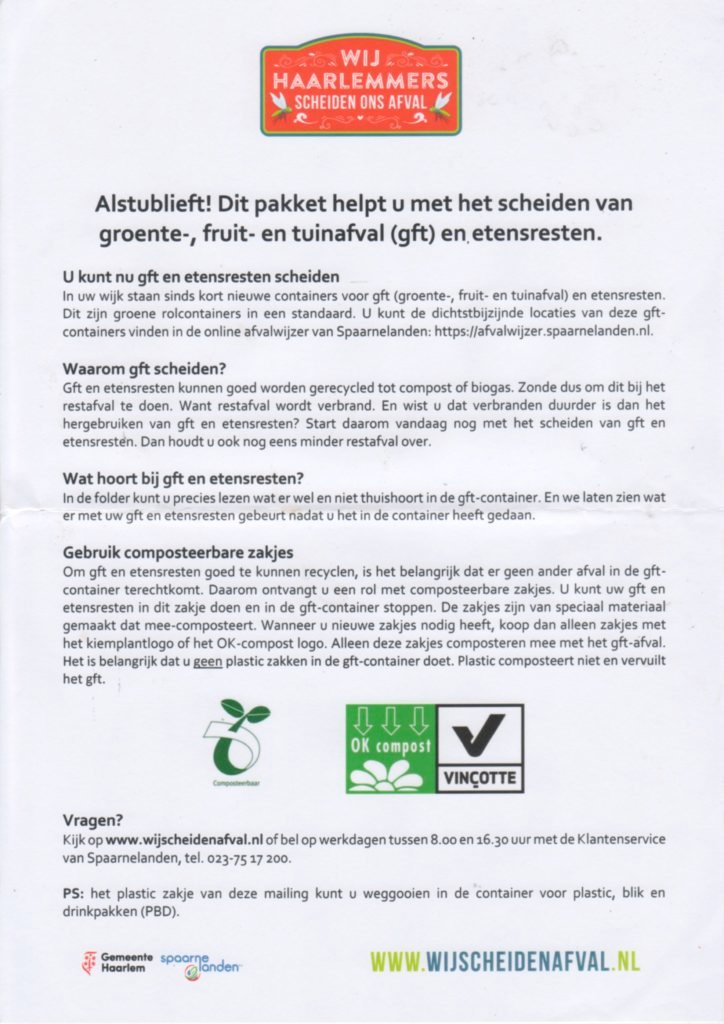 Brief gemeente over GFT inzameling In de wijk staan sinds kort nieuwe containers voor gft (groent-,duit- en tuinafval en etensresten. Dit zijn groene rolcontainers. Voor verdere informatie zie ook de folder