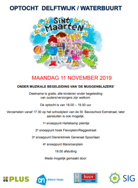 Op maandag 11 november vind weer de (bijna) jaarlijkse Sint Maarten optocht door Delftwijk Waterbuurt in Haarlem Noord plaats. De optocht, waar ruim 100 kinderen met ouders aan deelnemen, duurt een klein uur en onderweg zijn meerdere plekken waar snoep wordt uitgedeeld. De stoet wordt voorgegaan en muzikaal begeleid door De Muggenblazers. Deelname is gratis, alle kinderen onder begeleiding van ouders/verzorgers zijn welkom. Verzamelen vanaf 17:30 op het schoolplein van de St. Bavoschool Eemstraat, later aansluiten is ook mogelijk. De optocht is van 18.00 – 19.00 uur