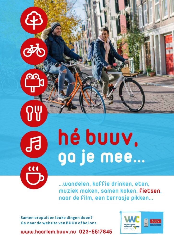 Vanaf maandag 27 september starten BUUV Haarlem en het Vrijwilligerscentrum Haarlem & omgeving met hun gezamenlijke campagne ‘Hé ga je mee, gaan we samen Eropuit!’ De bedoeling is tot en met 27 oktober zoveel mogelijk mensen aan elkaar te koppelen die het leuk vinden om allerlei verschillende activiteiten met elkaar te ondernemen. Samen wandelen, koken, naar de film, een terrasje pakken, fietsen of een kop koffie drinken. Iedereen die eropuit wil met een ander kan zich aanmelden op de websites van BUUV en VWC. Ook mensen die juist op zoek zijn naar iemand om iets gezelligs mee te ondernemen kunnen zich aanmelden via deze websites.