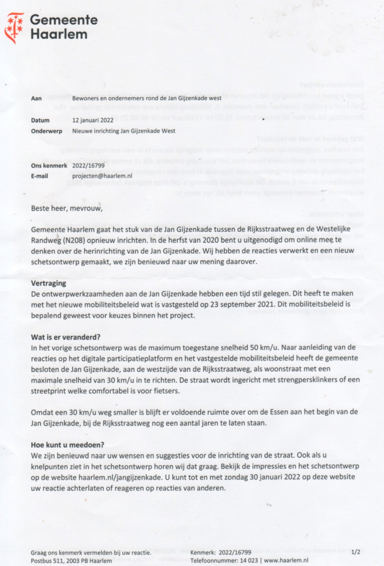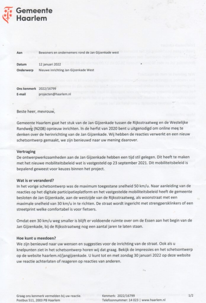 Nieuwe inrichting Jan Gijzenkade West Gemeente Haarlem gaat het stuk van de Jan Gijzenkade tussen de Rijksstraatweg en de Westelijke Randweg (N208) opnieuw inrichten. Ontwerp