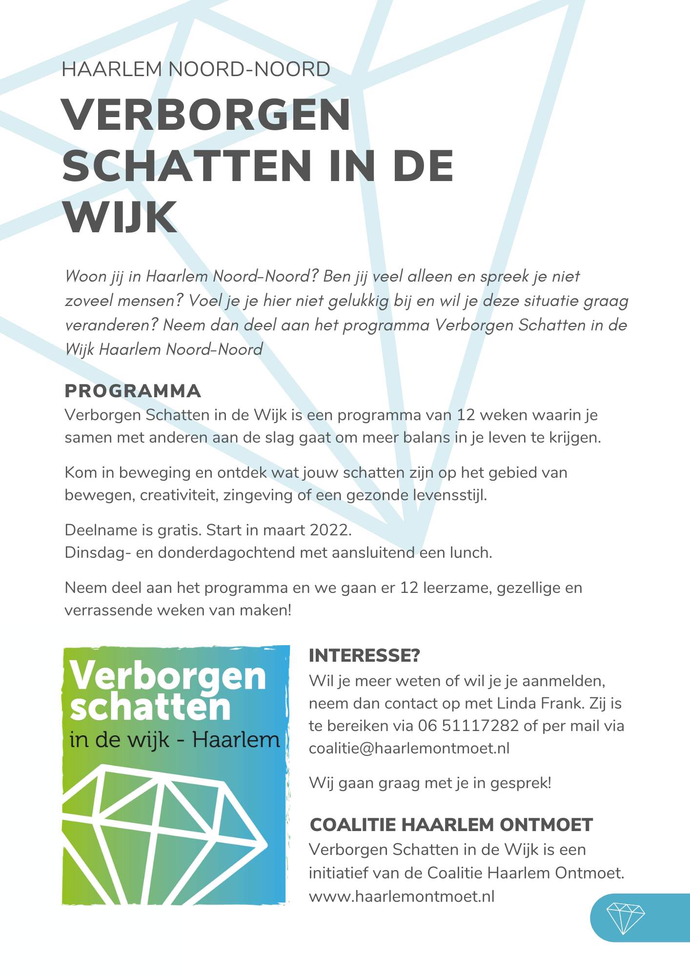 Verborgen Schatten in de wijk Woon jij in Haarlem noord-Noord? Ben je veel alleen en spreek je niet zoveel mensen ? Voel je je hier niet gelukkig bij en wil je deze situatie graag veranderen ? Neem dan deel aan het programma Verborgen Schatten van de wijk Harlem Noord-Noord