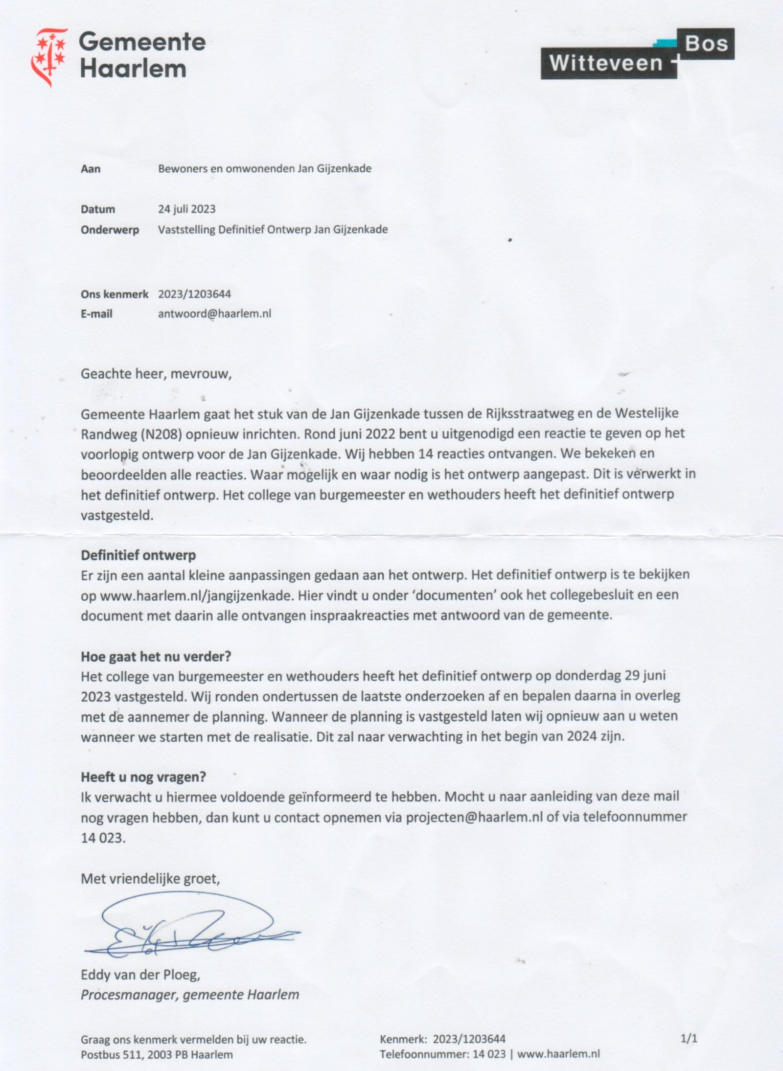 Vaststelling definitief ontwerp Jan Gijzenkade Brief van gemeente Haarlem aan bewoners van Delftwijk en Waterbuurt